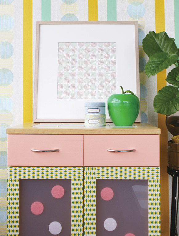 - Washi teip sobib suurepäraselt mööbli kaunistamiseks. Toolid, lauad, kapid, riiulid…teipida saab suuremaid pindu mustrite ja piltidega ja samas võib piisata ka riiuli serva värvi muutmisest.