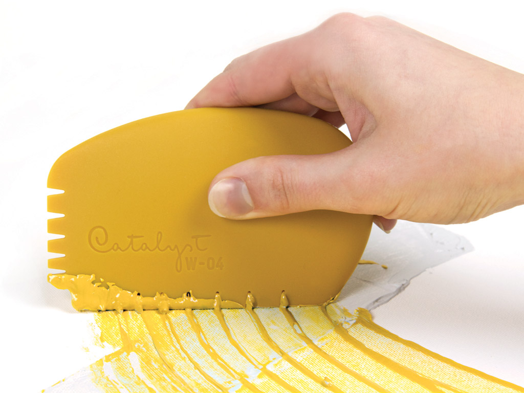 Catalyst tools come in unique shapes for a variety of different textures in your art. Designed for use with heavy-bodied paints, Catalyst is at home with oils, acrylics, and water-miscible oils. Because they are heat-resistant to 232°C, they excel with encaustics. Artists are using them with plaster, clay, surface coating, food crafting, and much more.