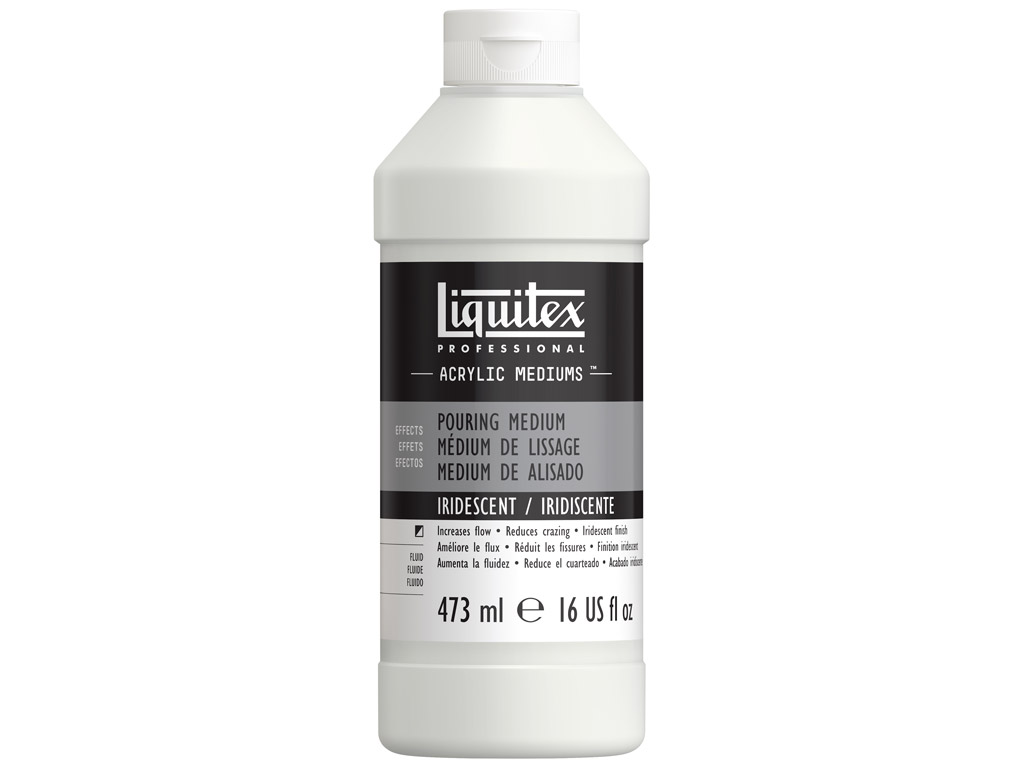 Prepare your color for smooth, high gloss, craze-free pours while lowering viscosity and increasing flexibility and all this with an iridescent shimmer! Liquitex Iridescent Pouring Medium gives even poured puddles and acrylic skins – results in a smooth surface, with no crazing, cracking or bubbles. It dries to a high gloss, iridescent finish and maintains color opacity, paint adhesion, durability and archival quality. It also extends your color further without affecting acrylic stability and lowers viscosity of heavier body paints, giving increased flow.