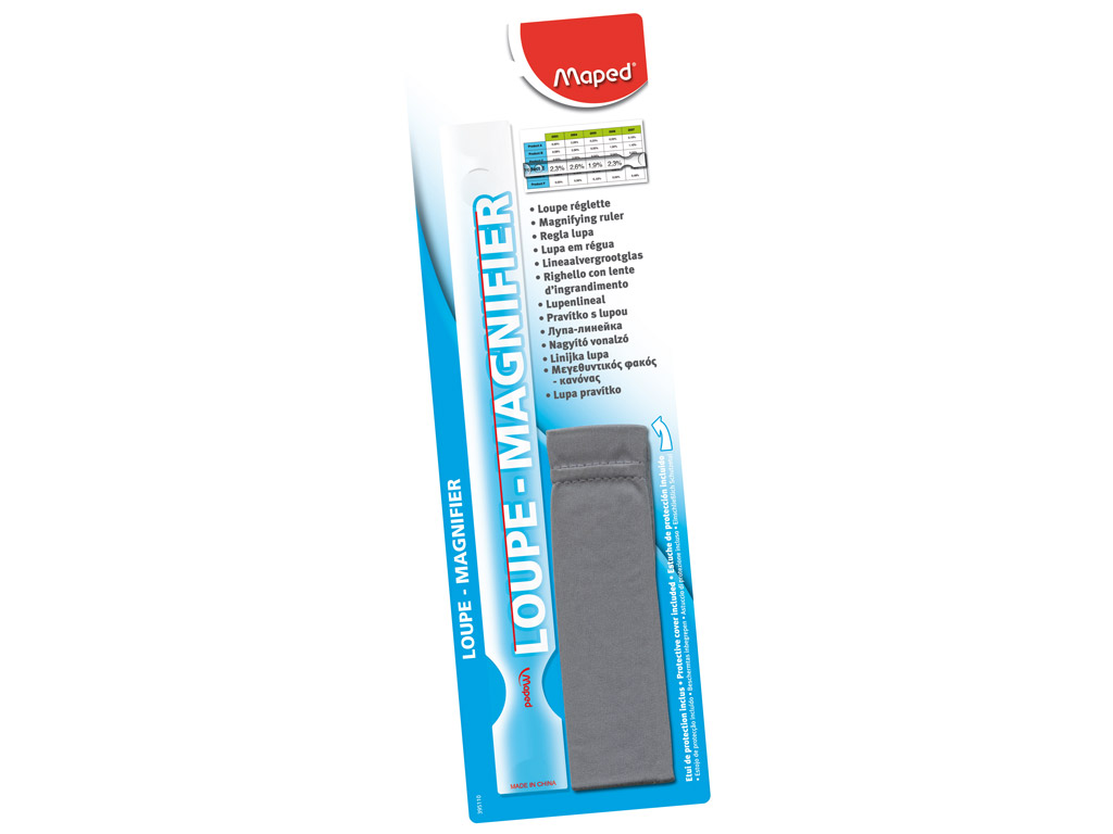 Bar magnifier with handle designed for good grip for effortless prolonged use. Has Built-in line for easy reading and comes with a protective sleeve. Magnifying factor: ruler x1.5, round area x3.