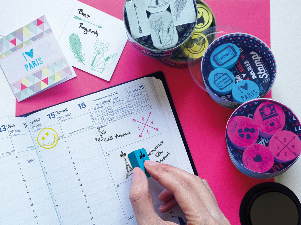 A set of rubber stamps with a foam rubber handle, including also a small ink pad. Suitable for various paper projects.