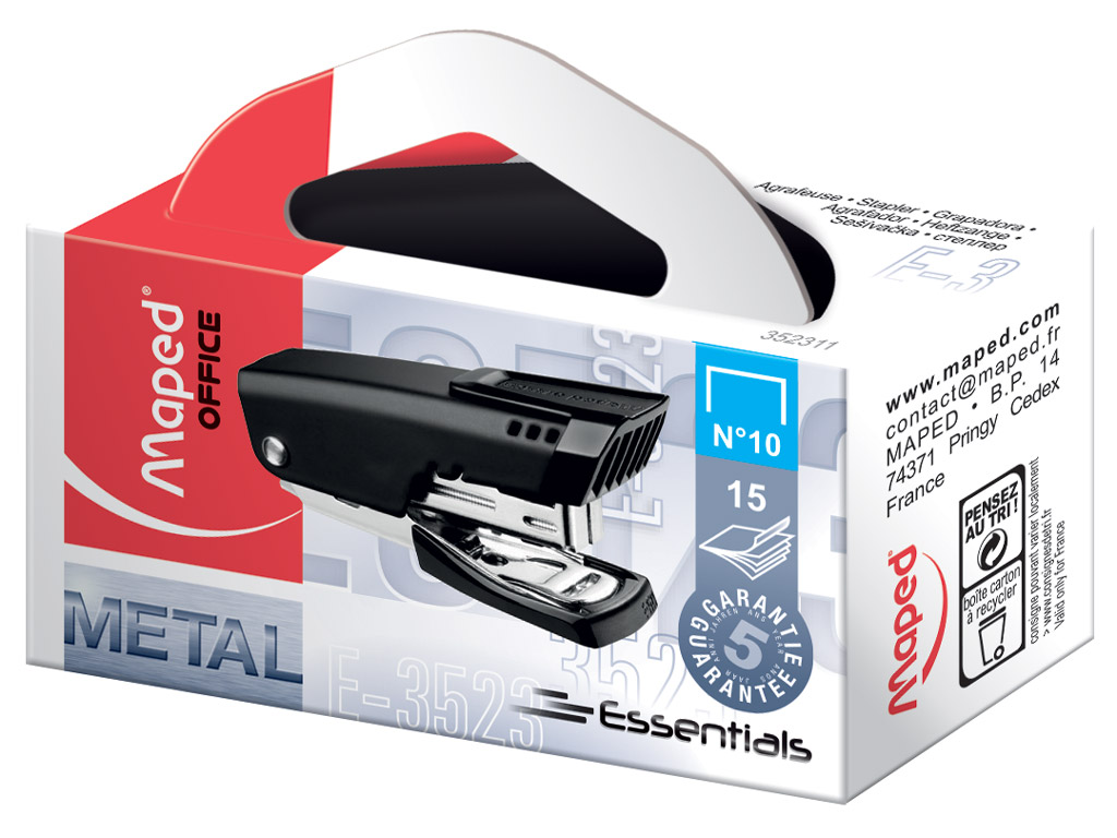 With the essentials range, Maped Office transforms your professional environment – technical and design product to support you on a daily basis. Essentials Metal stapler has 2 functions: stapling and nailing. 180° opening makes refilling easy. Now you’ve got everything you need for happy working!