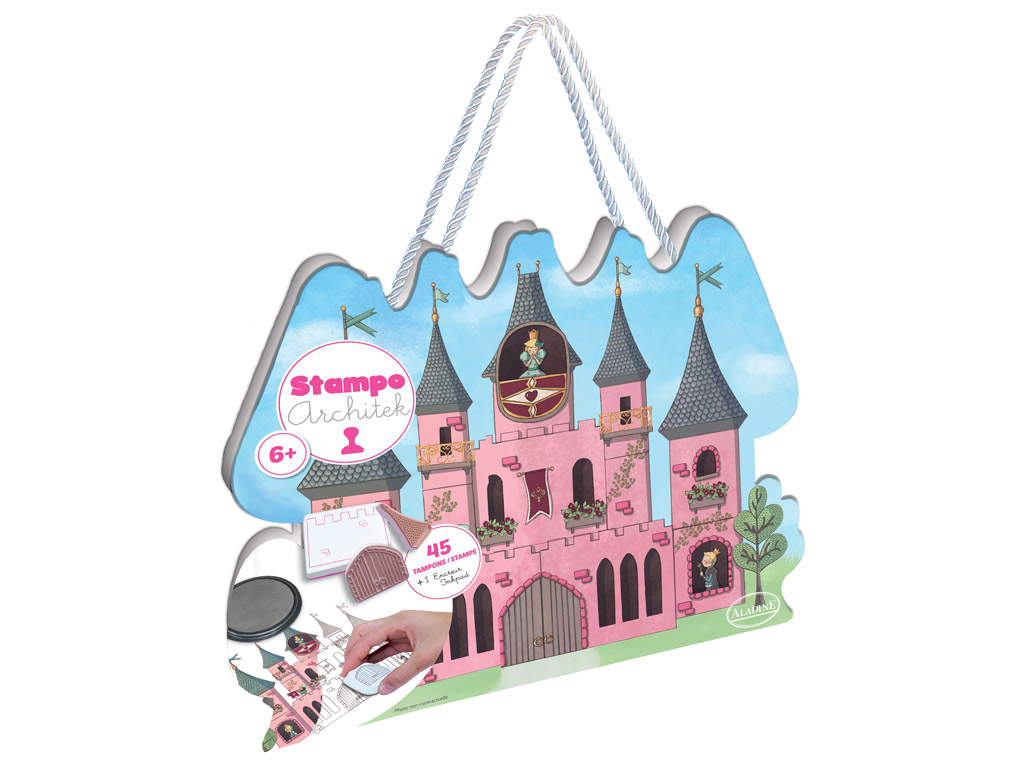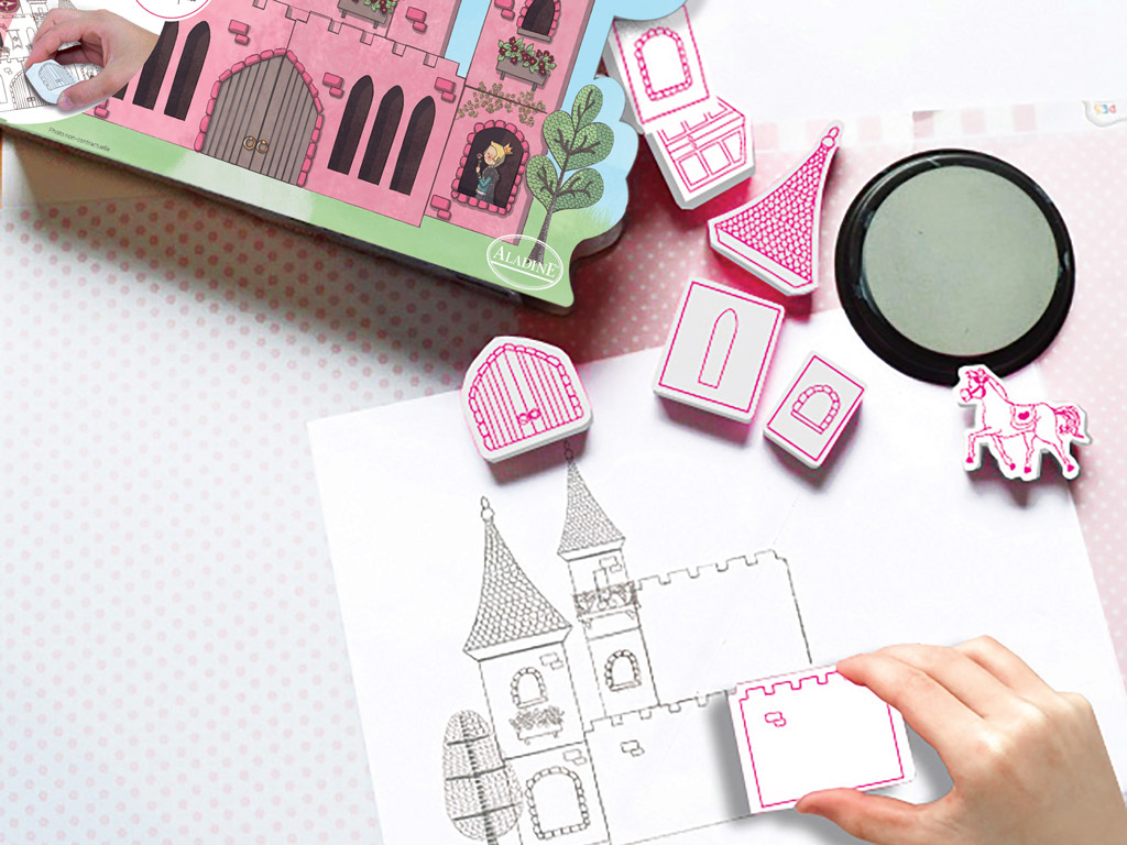 Guminių, su putplasčio rankena spaudų komplektas, kuriais vaikas galės sukurti savo svajonių pilį. Komplekte yra spaudai ir didelė pagalvėlė atspaudams.