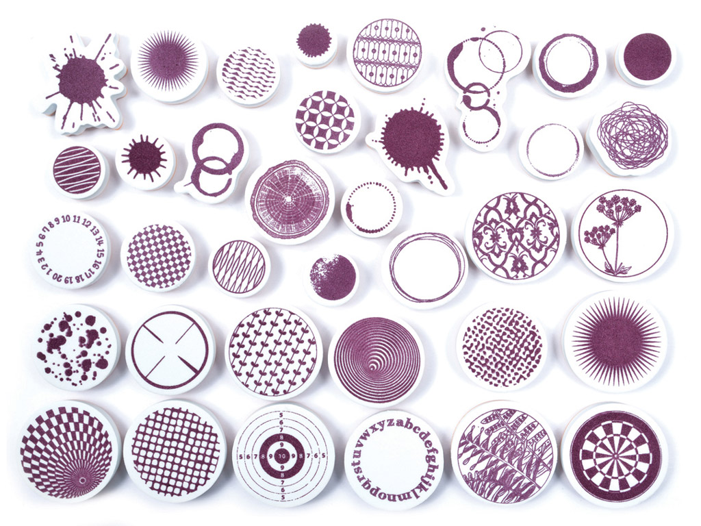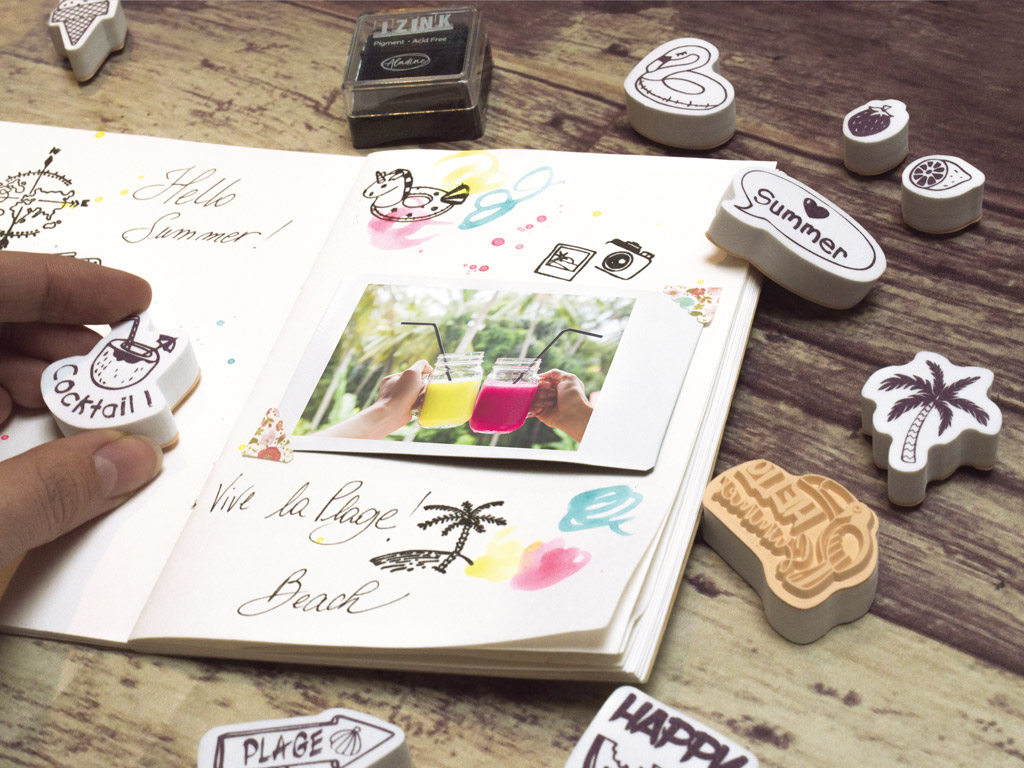 Guminių antspaudų su akytos gumos rankenomis komplektas, kuriame yra maža pagalvėlė antspaudams. Tinka įvairiems popieriaus dekoravimo darbams.