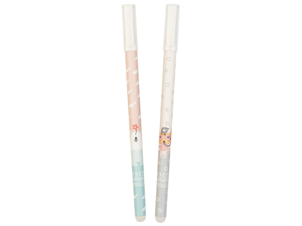 Linksmos išvaizdos gelinis rašiklis su temperatūrai jautriu ištrinamu rašalu. Tekstą galima pažymėti, žymes ištrinti ir vėl pažymėti, o tekstas išliks nepažeistas.