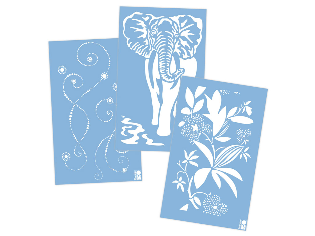 Piešķir sienām, mēbelēm un tekstilizstrādājumiem jaunu izskatu ar Marabu šabloniem! Marabu studijā radītos dizaina elementus var bez pūlēm izmantot dažādu priekšmetu vienotam noformējumam. Marabu piedāvā plašu dizaina produktu klāstu, kas palīdzēs īstenot visdažādākās idejas. Stingrais, ar lāzeru grieztais poliesteris un īpaši plānais materiāls nodrošina ļoti precīzu malu kontūru. Spiedogus var izmantot daudzkārtīgi, tie ir viegli tīrāmi un nesatur PVC.