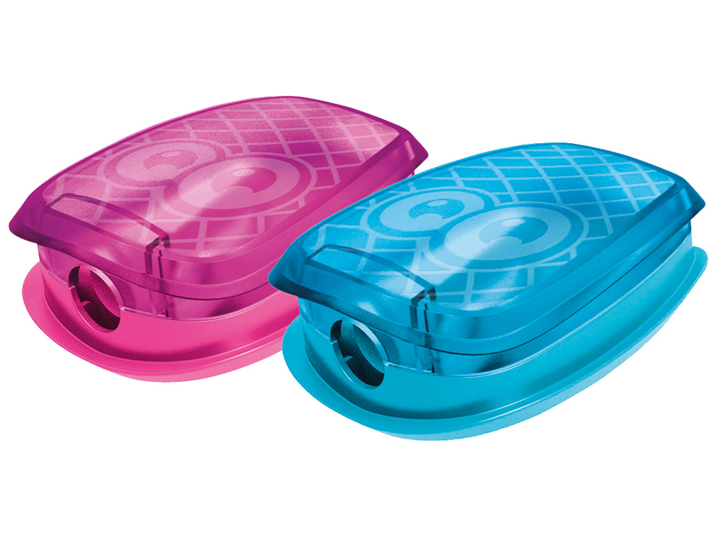 Krāsains asinātājs ar tvertni. Viena puse ir necaurspīdīga, otra – caurspīdīga.