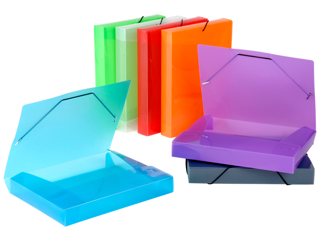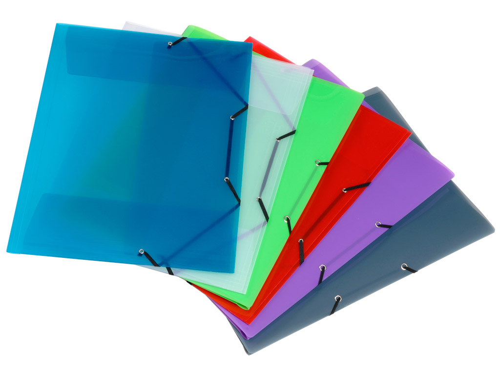 Värvilisest läbipaistvast plastikust mapp, millel on sulgemiseks nurgakummid.