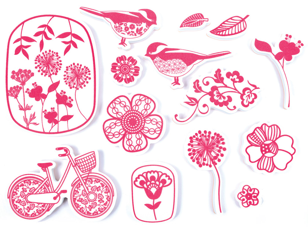 Spetsiaalselt tekstiilil kasutamiseks mõeldud kummitemplite komplekt. Templitel on mugav vahtkummist käepide. Komplekt sisaldab spetsiaalselt tekstiilitöödeks mõeldud tindiga suurt templipatja. Tekstiilitindiga tehtud tempel tuleb peale kuivamist läbi lapi kinnitada triikides puuvillase režiimil. Peale kinnitamist on tekstiilid pestavad 40°C juures kanga pahupoolelt.